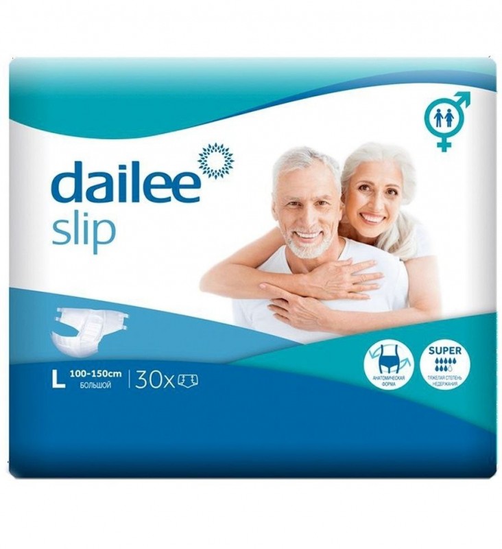 Подгузники Dailee для взрослых и малоподвижных людей с тяжелой степенью недержания. Многослойный впитывающий подгузник имеет универсальную анатомическую форму, которая подходит для использования мужчинами и женщинами.