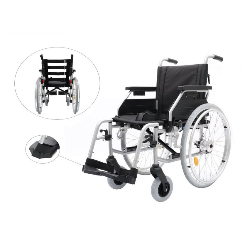 • Колеса: задние — пневматические (для ширины сиденья 39 см, 42 см, 45 см) или полиуретановые (для ширины сиденья 48 см, 51 см), быстросъемные, диаметром до 610 мм, что обеспечивает хорошую проходимость на различных покрытиях. Передние колеса полиуретановые диаметром 178 мм.