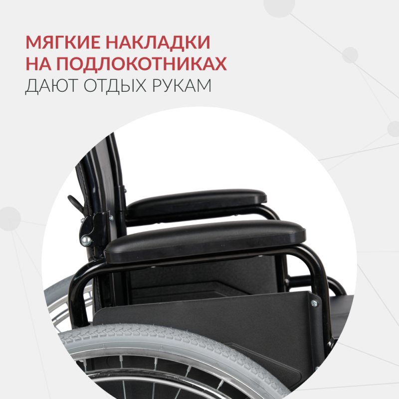 Для удобства пересаживания подлокотники откидываются. Их ступенчатая форма позволяет подъехать вплотную к столу, что очень удобно для работы, досуга и приёма пищи. Благодаря мягким накладкам на подлокотниках в коляске можно находиться дольше и с большим комфортом.