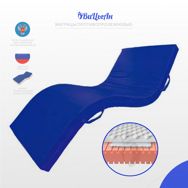 Матрац изготовлен из эластичного пенополиуретана со специальным трапециевидным профилем, с эффектом "воздушной подушки", гелевым наполнителем и натуральным латексом, это сочетание эффективно распределяет давление тела пациента на поверхности ложа.Матрац предназначен для людей с нарушением функций опорно-двигательного аппарата и нервной системы в целях предотвращения пролежней. Профилактика пролежней при длительном лежании. Обеспечение максимального комфорта. Комплексная реабилитация лечения пролежней. Для комфортного сна. Имеет направление положения.Матрац изготовлен из эластичного пенополиуретана со специальным трапециевидным профилем, с эффектом "воздушной подушки", гелевым наполнителем и натуральным латексом, это сочетание эффективно распределяет давление тела пациента на поверхности ложа.Матрац предназначен для людей с нарушением функций опорно-двигательного аппарата и нервной системы в целях предотвращения пролежней. Профилактика пролежней при длительном лежании. Обеспечение максимального комфорта. Комплексная реабилитация лечения пролежней. Для комфортного сна. Имеет направление положения. Уникальная конструкция матраца имеет в основании трапецевидный профиль, который формирует независимые конусы, эффективно распределяющие давление тела на поверхности ложа кровати. Поперечный профиль на нижней стороне матраца, позволяет ему принимать форму ложа, 1-2-3-4-секционной кровати. В зонах повышенного риска образования пролежней расположены ниши со вставками из 6-ти упруго-перетекающих гелевых элементов по 4-ре независимых камер.