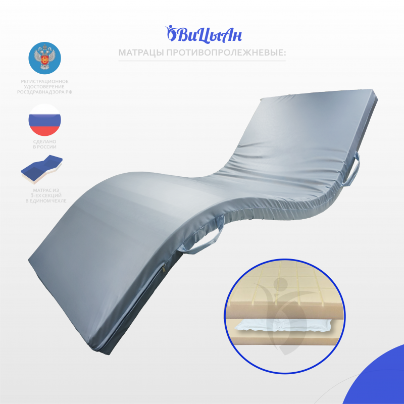 Матрац предназначен для людей с нарушением функций опорно-двигательного аппарата и нервной системы в целях предотвращения пролежней. Профилактика пролежней при длительном лежании. Обеспечение максимального комфорта. Комплексная реабилитация лечения пролежней. Для комфортного сна. Имеет направление положения тела (указана последовательность сборки в чехол вшита бирка со стороны головы).Противопролежневый матрац гелевый состоит из трех формообразующих секций изготовленный из вязкоэластичного латексированного пенополиуретана. Верхняя сторона имеет профиль в виде квадратных подушечек, матрац имеет три секции.. Наполняемость внутреннего объема, гель (упругоперетекающие гелевые элементы). Каждый блок (секция), зачехлен в чехол из нетканного материала. Допустимая нагрузка 120 кг. Съемный влагонепроницаемый чехол матраца, комбинированный на молнии, изготовлен из материала двух видов ТК-12 / ТК-7 (Основа – высокоэластичная трикотажная сетка, верхний слой – прозрачное водонепроницаемое термопластичное полиуретановое мембранное покрытие/синтетический материал с полиуретановым пленочным покрытием) В чехол вшита молния. Материал чехла (состав): 82% полиэстер, 18% полиуретан/100% полиэстер Плотность ткани чехла, 150/125 г/м². Матрац упакован в картонный короб с полиэтиленовым вкладышем.1. Благодаря уникальной конструкции матрац равномерно распределяет нагрузку тела на поверхности ложа создавая благоприятные условия для полноценного лечения.2. Верхний профиль наполнителя формирует между собой воздушные каналы, создавая вентиляцию, что значительно увеличивает срок эксплуатации.3. Съемный чехол легко снимается, поэтому осуществлять надлежащий уход и своевременную обработку, дезинфекцию, стирку и сушку (в зависимости от загрязнения) можно многократно. 4. Не имеет швов на рабочей поверхности5. Молния защищена влагонепроницаемым клапаном6. Благодаря водонепроницаемому покрытию, жидкость с поверхности чехла легко удаляется и не проникает во внутрь изделия.7. Специальная антибактериальная обработка, защищает от распространения бактерий.8. Эластичность чехла позволяет не вызывает ответного давления и способствует равномерному распределению массы тела на поверхности ложа.9. Антискользящая поверхность препятствует скатыванию постельного белья10. Высокая паропроницаемость.