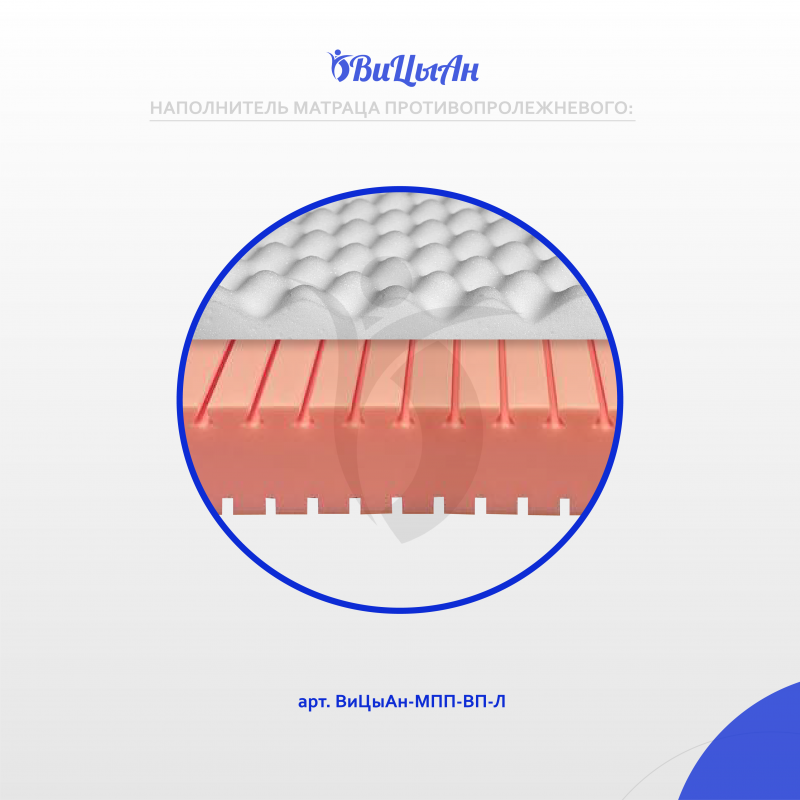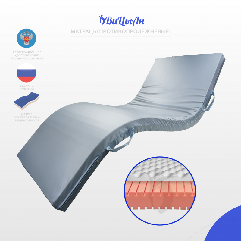 Область применения – матрацы предназначены для использования в поликлинических, клинических и гостиничных комплексах, а так же в быту и различных видах транспорта.Показания к применению – необходимость равномерного распределения давления на тело пациента, с целью профилактики образования пролежней у больных с нарушением опорно-двигательного аппарата, для снятия нагрузки на позвоночник.Противопоказания - вытяжение шейные и скелетные, травмы позвоночника и спинного мозга, при наличии открытых пролежней и по остальным противопоказаниям необходимо проконсультироваться с лечащим врачом.Побочные действия не выявлены.Уникальный, запатентованный, трапецевидный профиль, формирует независимые конусы, которые в сочетании со слоем натурального, перфорированного латекса, эффективно распределяют давление тела на поверхности ложа кровати. Поперечный профиль на нижней стороне матраца, позволяет ему принимать форму ложа, 1-2-3-4-секционной кровати. Влагонепроницаемый съемный чехол матраца изготовлен из мембранной, синтетической ткани (полиэстер 100%) с влагонепроницаемым, паропроницаемым, полиуретановым, покрытием плотностью 150 г/м² . На чехле по центру торцевой части вшита молния.. Благодаря уникальной конструкции матрац оказывает хорошую поддержку тела во время сна и создает все условия для полноценного лечения.2. Ячейки наполнителя не слипаются, независимые конусы даже при максимальой нагрузке на них оставляют между собой воздушные каналы, создавая вентиляцию, что значительно увеличивает срок эксплуатации.3. Съемный чехол легко снимается, поэтому осуществлять надлежащий уход и своевременную обработку, дезинфекцию, стирку и сушку (в зависимости от загрязнения) матраса можно многократно. 4. Не имеет швов на рабочей поверхности5. Молния защищена влагонепроницаемым клапаном6. Благодаря водонепроницаемому покрытию, жидкость с поверхности чехла легко удаляется и не проникает во внутрь изделия.7. Специальная антибактериальная обработка, защищает от распространения бактерий.8. Эластичность чехла позволяет не вызывает ответного давления и способствует равномерному распределению массы тела на поверхности ложа.9. Антискользящая поверхность препятствует скатыванию
