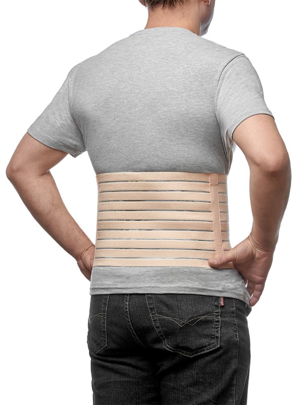 Бандаж изготовлен из эластичных воздухо- и влагопроницаемых материалов, состоит из широкого пояса на застежке с двумя ребрами жесткости по бокам. Изделие обеспечивает профилактику ущемления или прогрессирования грыж при физической работе, натуживании, при слабости мышц брюшной стенки. Обеспечивает оптимальные условия для формирования рубца после операций на органах брюшной полости или после кесарева сечения.