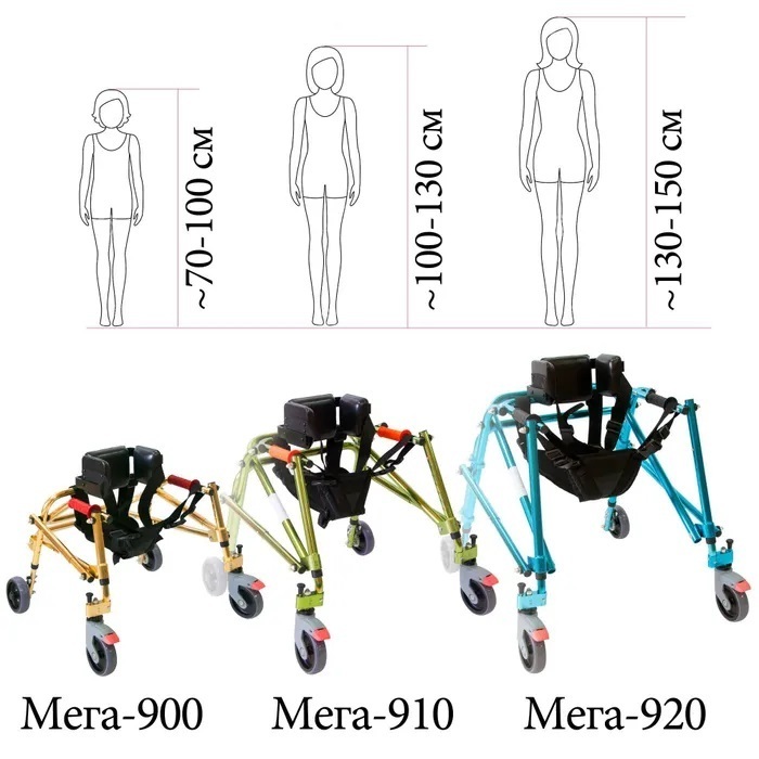Ходунки поставляются для детей-инвалидов с различными антропометрическими данными в трех типоразмерах.