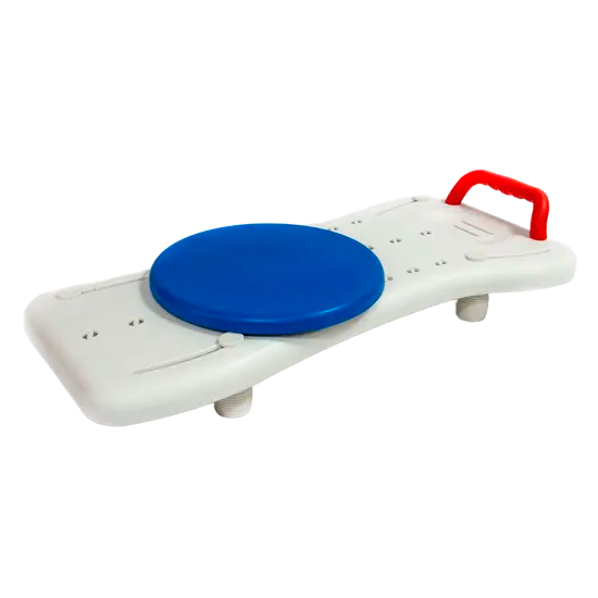 Сиденье выполнено из легкого и прочного пластика с рифленой поверхностью и дренажными отверстиями для стекания воды. На поверхности сиденья есть специальная выемка для мыла, мочалки или других принадлежностей. Сиденье оборудовано вращающимся диском, который облегчает перемещение пользователя во время водных процедур.