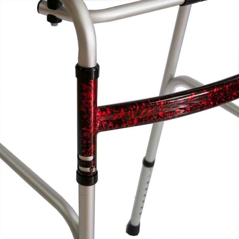 Опорные поручни ходунков выполнены из анодированного алюминия и не подвергаются коррозии, соединяющая рама – из стали с полимерным покрытием. Ходунки легко складываются и не занимают много места, имеют 8 положений регулировки высоты с шагом в 2,5 см. Мягкие накладки на поручнях ходунков не дают рукам скользить. Резиновые наконечники предохраняют от скольжения по твердым поверхностям.