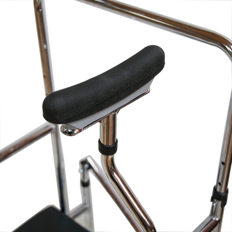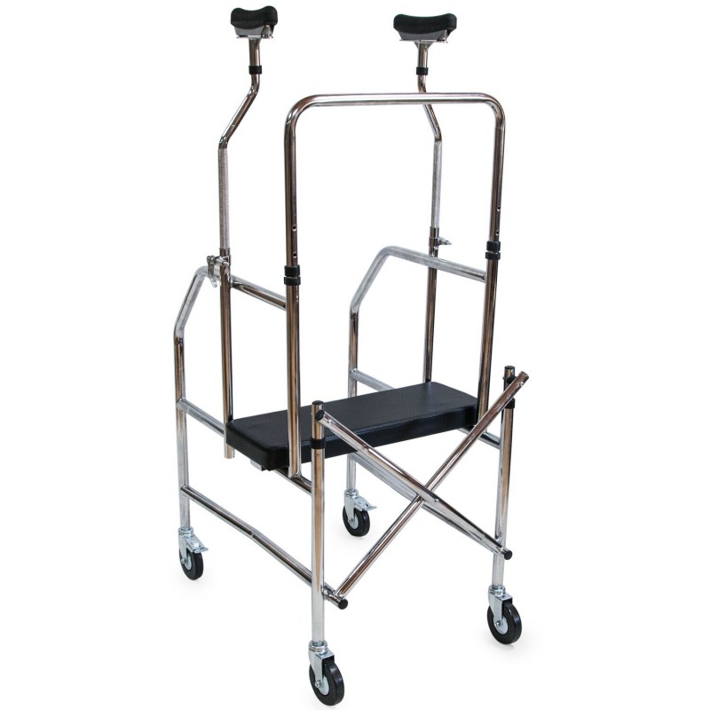 Ходунки и подмышечные стойки выполнены из хромированной стали и не подвергается коррозии, съемное сиденье выполнено из искусственной кожи. Четыре колеса конструкции обеспечивают легкость передвижения без лишних усилий. Задние колеса оснащены стояночными тормозами.